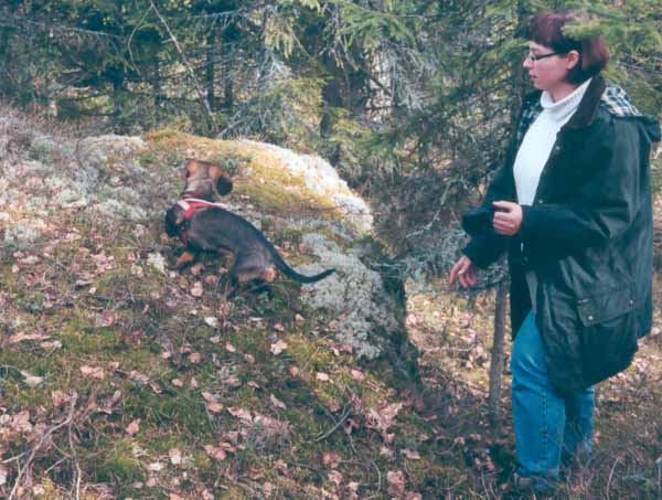 My father, a real gundog-enthusiast, found himself to be a dachshund enthusiast in his old days. We brought a "working lineage" dachshund from Sweden. She was in the field at the age of 14 weeks in order to get used to the smells and sounds of the forest. She got a fresh track of a deer and started following it. Different kinds of deers has been shoot by today.